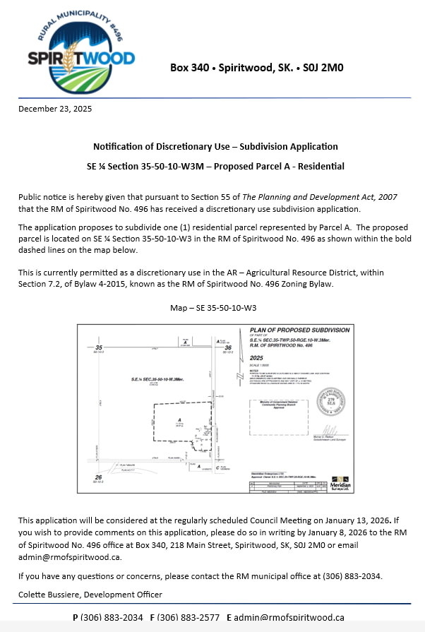 The RM of Spiritwood snow clearing policy only provides service to municipal roads that give access to an assessed, occupied residential dwelling or permitted commercial operation. Please ensure you have adequate snow clearing equipment or make arrangements for snow clearing services should you require access to lands for the purpose of, but not limited to, feeding livestock, accessing grain storage, accessing feed (bales) etc.